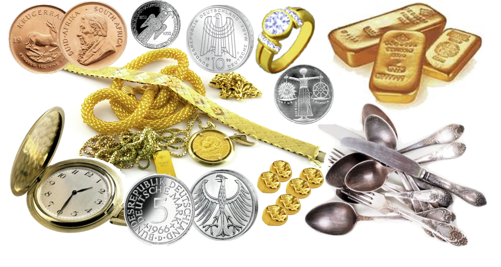 Wir kaufen Altgold, Goldschmuck (auch mit Brillianten), Zahngold, Goldmünzen, Goldreste, Goldbarren, Silber, Platin, Palladium sowie alle anderen Arten von Edelmetall-Legierungen zu tagesaktuellen Höchstpreisen, die sich an die internationalen Börsenpreise richten.